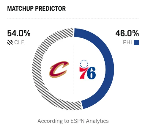 赛前,美媒ESPN预测本场比赛,骑士胜率54.0%,76人胜率46.0%。